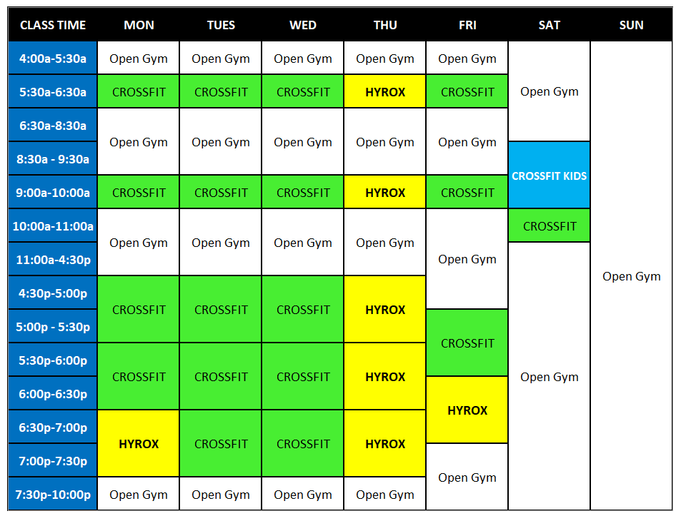 We are a Hybrid AF facility. Your membership includes full access to “OPEN GYM” from 4a - 10p, seven days a week, 365 days a year. All open (white) slots are reserved for OPEN GYM time. If you can’t make it to a class time, then no worries, you can come and do the daily workout (or your own programming) anytime that suits your schedule!